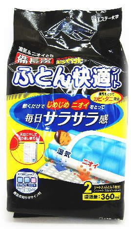 エステー化学 湿気&ニオイとり 備長炭ドライペットふとん快適シート 2シート入 【15dw12】価格: 980円レビュー評価: 5.0 レビュー数:5 名 称 湿気&ニオイとり 備長炭 ドライペット ふとん快適シート 2シート入(ふとん1枚分) 内容量 310g×2シート 有効期間 約1年間(温度や湿度の状態によって異なります) ・シリカゲルの黄ばみが強くなりましたら、新しい「ふとん快適シート」にお取り替えください。 ・シートの表面が汚れたり、毛羽立ちが目立つようになった時は新しい「ふとん快適シート」にお取り替えください。 特 長 就寝時のふとん用除湿剤!! ********************************** ●汗や湿気をすばやく吸収 じめじめをすばやく除去し、ふとんにサラサラ感を持たせます。 ●ニオイをしっかり脱臭 備長 |
